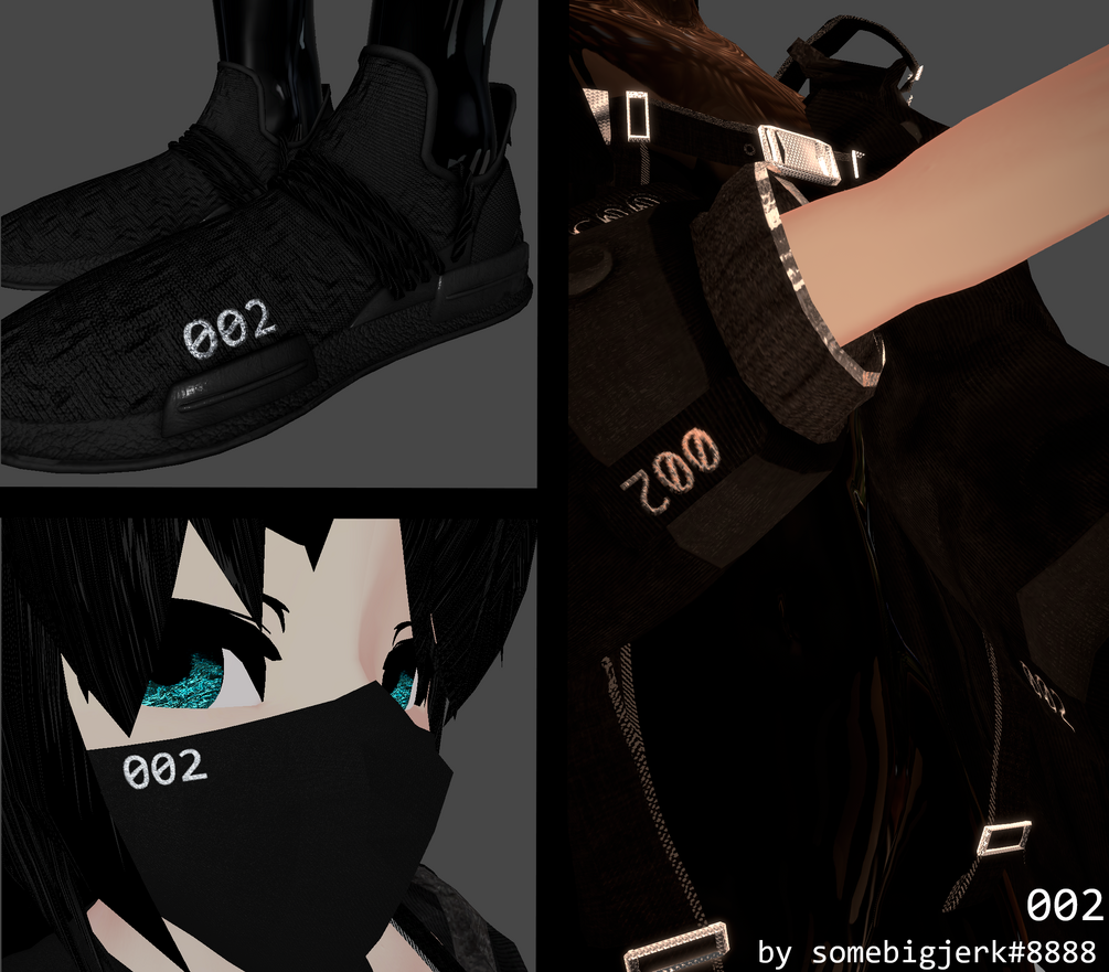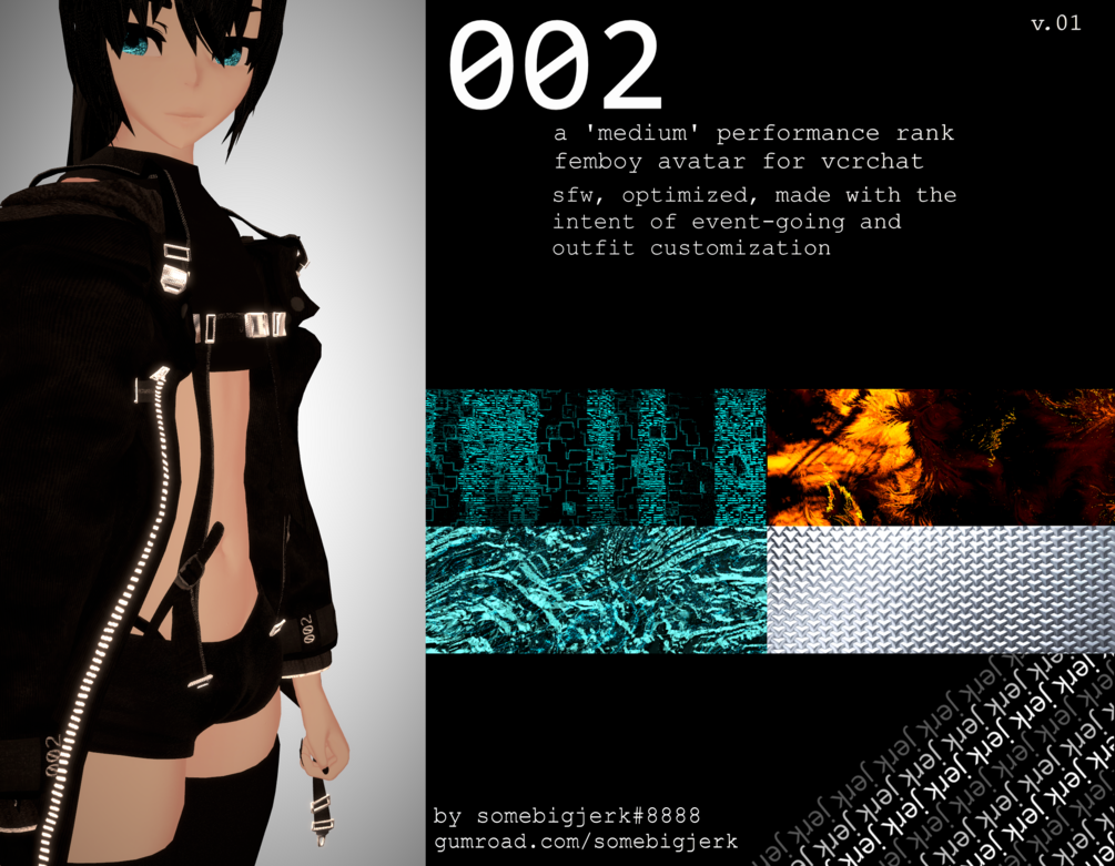 002 Is an optimized femboy avatar made with the intent of event-going and outfit customization in mind. It was made with the mindset of (trying to) create something cool, to be considerate to those around me at VRChat music shows and events, and to try and maintain reasonable optimization. Much consideration was put into the ability to mix and match outfit parts and materials to change the way you look depending on your desires. The avatar is still capable of accomplishing a risque look by donning a latex bodysuit. Or if you're feeling more cozy and don't want to be so revealing, consider throwing on the jacket, mask, shoes, and bundle up. Maybe you want to show off your cool audiolink materials, maybe you don't. The hope is to do it all.
